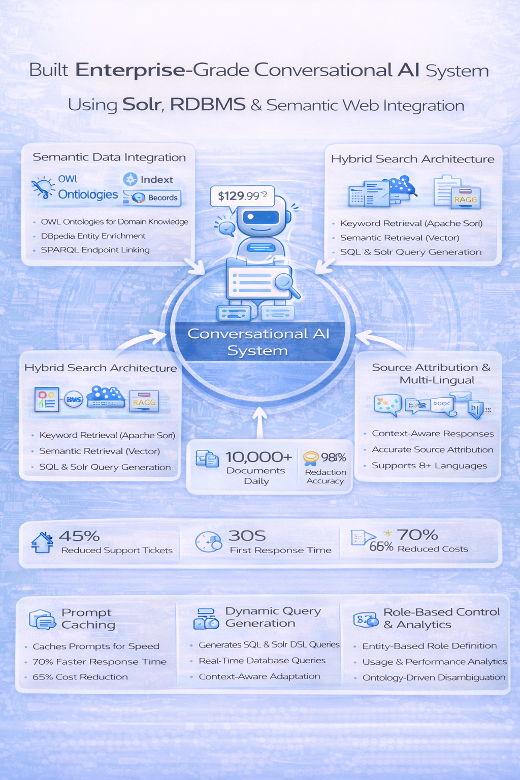 Built enterprise-grade conversational AI system providing intelligent responses by querying structured data from Apache Solr indexes and relational databases. Implemented semantic web integration using OWL ontologies for domain knowledge representation and DBpedia SPARQL endpoint for entity enrichment and linking. The chatbot uses AWS Bedrock’s Claude models with RAG (Retrieval Augmented Generation) architecture, combining semantic search across 50M+ indexed records with real-time database queries and ontology-based reasoning. Features hybrid search combining keyword (Solr) and semantic (vector) retrieval, dynamic query generation for SQL and Solr DSL, context-aware responses with source attribution and multi-lingual support (8+ languages). Implemented prompt caching to reduce latency by 70% and costs by 65%. Includes role-based access control, analytics dashboard for usage patterns and ontology-driven entity disambiguation. Reduced customer support tickets by 45% and improved first-response time from 4 hours to under 30 seconds.