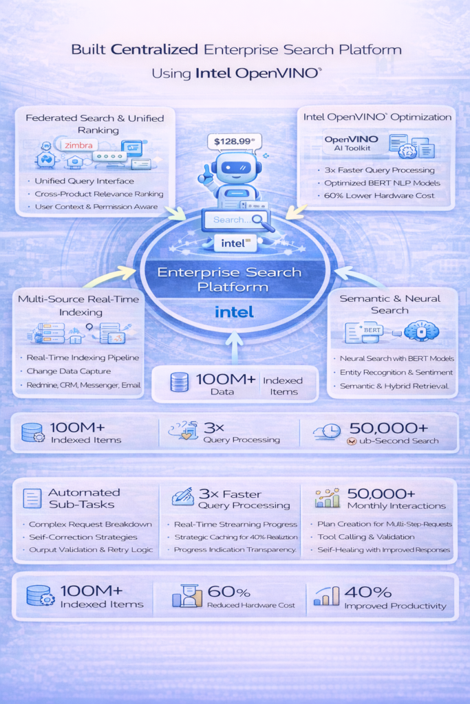 Developed centralized search platform providing unified search experience across multiple enterprise products including Zimbra email, Prosody-based messenger, CRM system, and Redmine project management. Integrated Intel OpenVINO toolkit for AI model optimization and inference acceleration, achieving 3x faster query processing and semantic search. The system indexes data from heterogeneous sources in real-time, providing single search interface with cross-product relevance ranking. Implemented neural search capabilities using OpenVINO-optimized BERT models for query understanding and document embedding. Features include federated search with unified ranking algorithm, real-time indexing with change data capture, personalized search results based on user context, permissions and advanced filters for each product type. Used OpenVINO for accelerating NLP models (entity recognition, sentiment analysis, text classification) on CPU infrastructure, reducing hardware costs by 60%. Supports full-text search, semantic search, and hybrid retrieval modes. Achieved sub-200ms search latency for queries across 100M+ indexed items and improved user productivity by 40% through faster information discovery. Project was sponsored and technically validated by Intel.