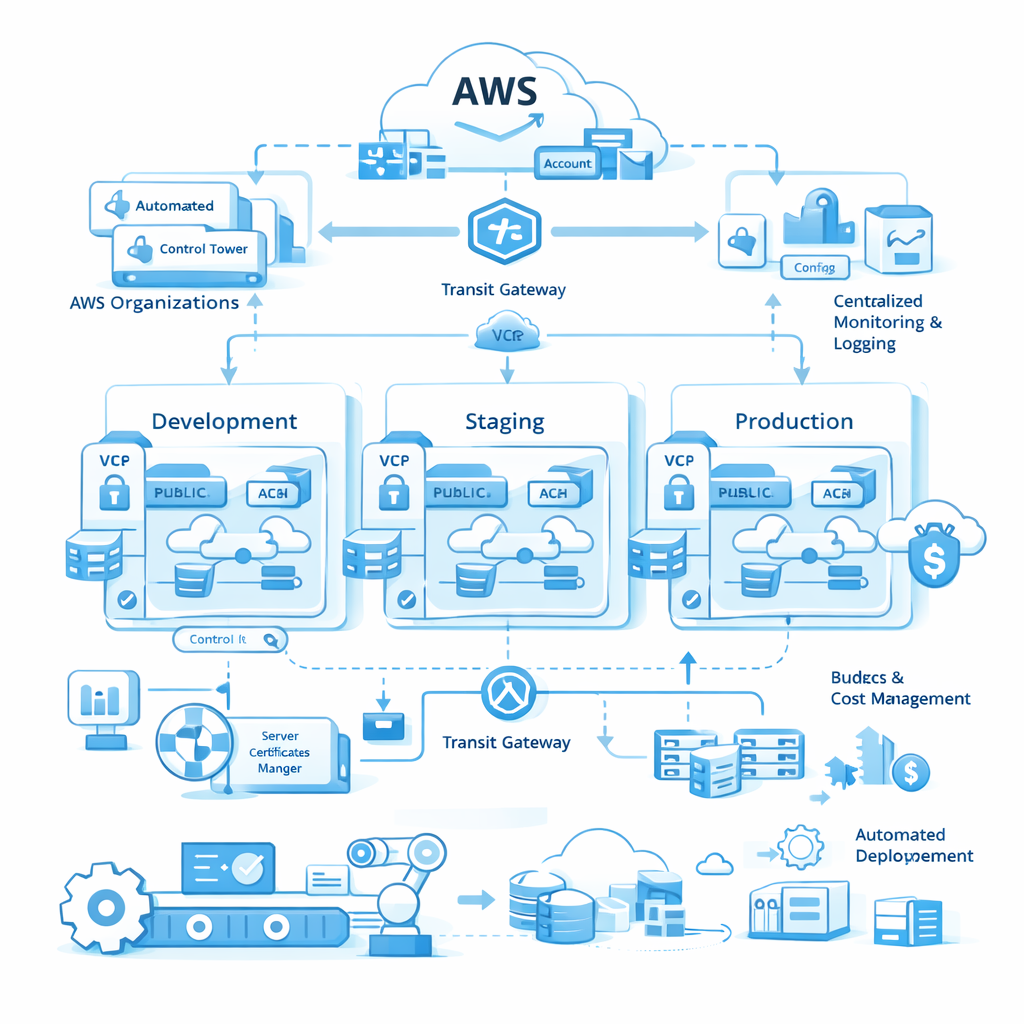 Description: Built automated framework for provisioning complete AWS environments (dev, staging, production) with pre-configured security, networking, and monitoring stacks. Implemented account factory pattern using AWS Organizations and Control Tower for standardized multi-account setup with centralized logging via CloudWatch and AWS Config. Each environment deployment includes VPC with public/private subnets, security groups, IAM roles with least-privilege access, CloudWatch dashboards, Transit Gateway for inter-VPC communication, automated backup strategies with cross-region replication, and cost management with budgets and anomaly detection. Features one-command deployment of complete environment in approximately 20 minutes, environment-specific parameter management using AWS Secrets Manager, automated SSL certificate provisioning with ACM, pre-configured CI/CD pipelines with CodePipeline, and compliance monitoring with AWS Config Rules and Security Hub. Reduced new environment setup from 2 weeks to 1 day and enabled 5 development teams to work independently with standardized infrastructure.
