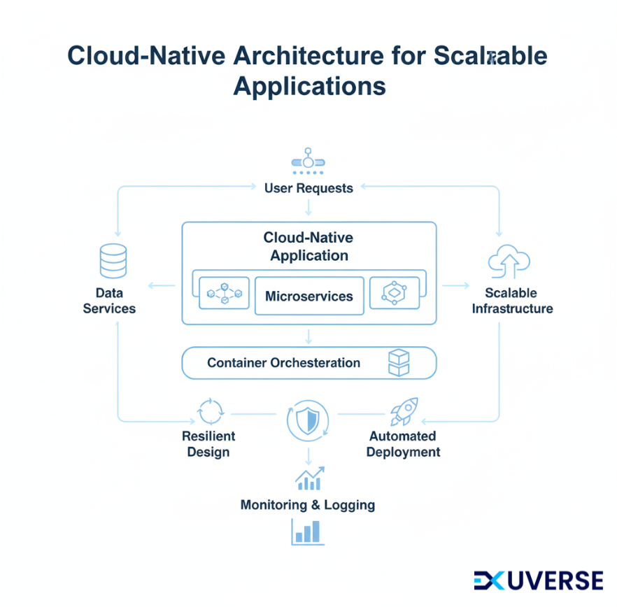 Cloud-native architecture is designed to build, deploy and scale applications efficiently in modern cloud environments. Using microservices, containers, and orchestration platforms, businesses achieve greater flexibility and resilience.