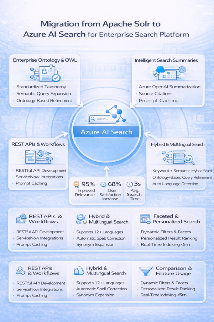 Led migration from Apache Solr to Azure AI Search for global enterprise search platform serving 50,000+ employees. Implemented enterprise ontology using OWL for standardized taxonomy across departments and knowledge domains, enabling semantic search and intelligent query expansion. Developed RESTful APIs and ServiceNow workflows, integrated Azure OpenAI with prompt caching for intelligent search summaries with source citations. The system uses hybrid search combining keyword and semantic search with ontology-based query refinement, achieving 95% relevance improvement. Added multilingual support for 12+ languages with automatic language detection. Features include faceted navigation with dynamic filtering, personalized search results based on user role and history, real-time indexing with under 5-minute latency, and advanced query understanding with spell correction and synonym expansion powered by domain ontologies. Reduced average search time from 45 seconds to 3 seconds and increased user satisfaction by 68%.