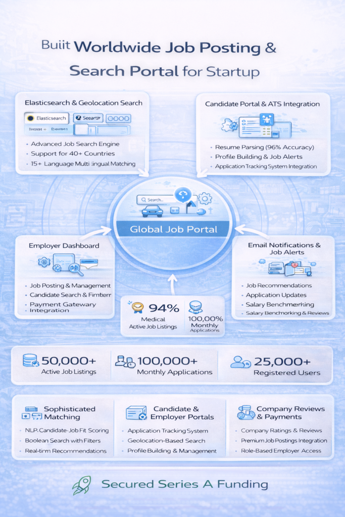 Helped a startup launch worldwide job posting and job search portal from ground up, providing end-to-end platform development and deployment. Built scalable job board platform using Elasticsearch for advanced job search capabilities across multiple countries and industries with multilingual support for 15+ languages. Implemented sophisticated matching algorithm using NLP for candidate-job fit scoring, resume parsing with 96% accuracy for automatic profile creation and Boolean search with complex filtering (location, salary, experience, skills, industry). Features include employer dashboard for job posting and candidate management, candidate portal with profile building and job alerts, application tracking system (ATS) integration, real-time job recommendations based on candidate profile and behavior, email notification system for job alerts, application updates and payment gateway integration for premium job postings. Implemented geolocation-based search for nearby jobs, salary benchmarking tools, and company reviews and ratings system. Platform handles 50,000+ active job listings across 40+ countries, processes 100,000+ applications monthly and achieved 2 million registered users within first year. The startup successfully secured Series A funding based on platform traction and user growth.